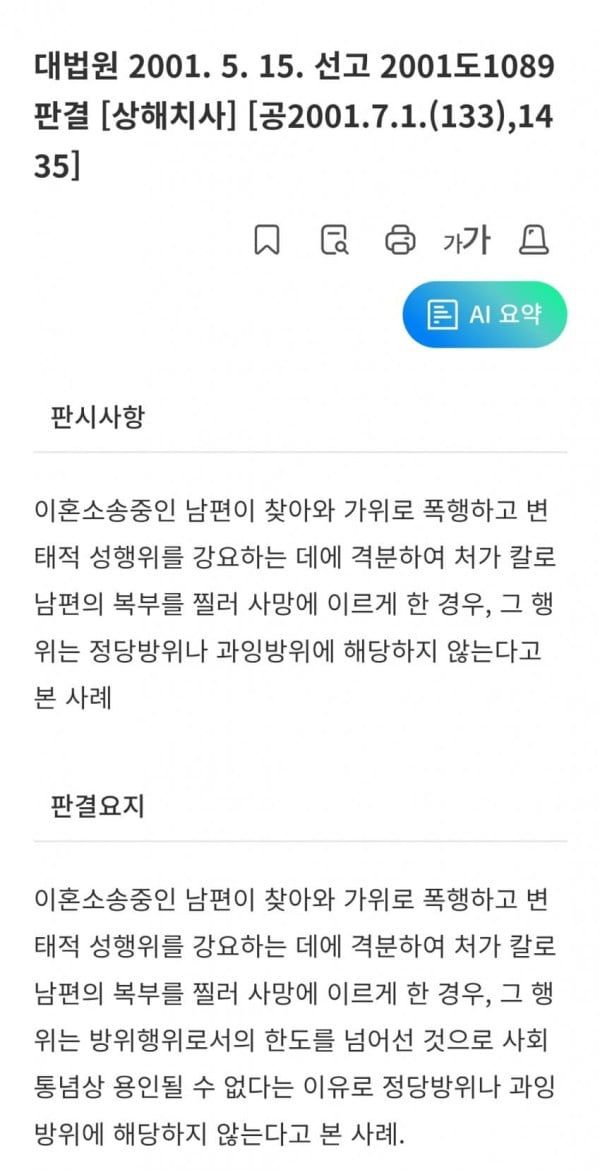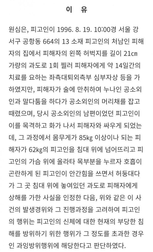이혼소송중인 남편이 찾아와서 빻취 야스하자고 가위로 폭행해서 칼로 찔러죽였는데 정당방위, 과잉방위 아님 걍 살인