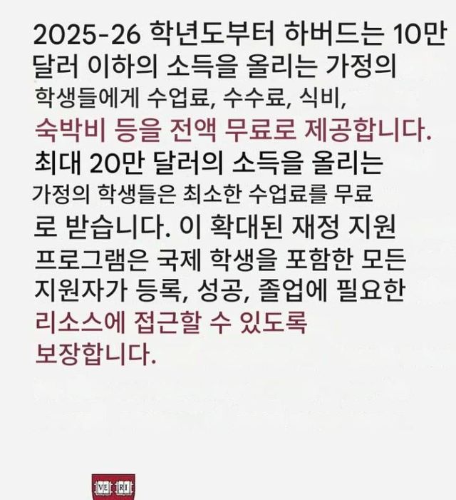 하버드대학교는 연소득 10만불(1억 4,518만 원) 이하인 가정의 학생은 등록금, 식비, 주거비, 기타 비용 전액 무료연소득 20만불(2억 9,032만 원) 이하인 가정의 학생은 등록금이 면제를 발표함