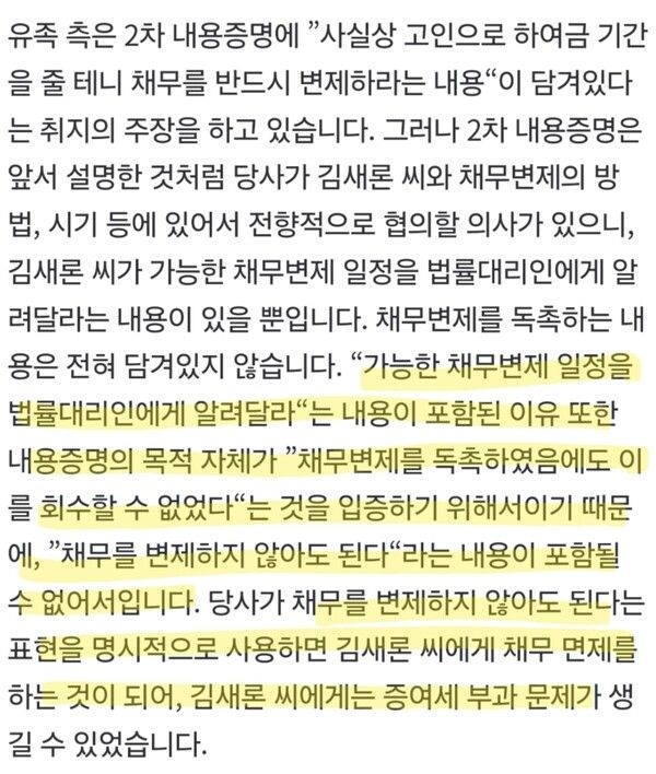 이어 "내용증명 내용에는 채무 문제를 법적 권한이 없는 사람과 논의하지 말고 담당 변호사와 직접 소통하라는 취지가 담겼을 뿐, 김새론씨에게 소속 배우들과의 연락을 금지한 것이 아니다"라고 강조했다.