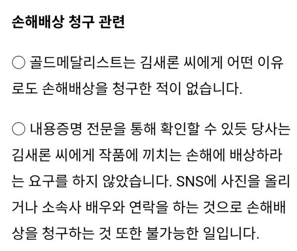 골드메달리스트는진실 공방 속 이어지는 양측 입장며 "당사가 보낸 내용증명을 보면 작품 손해에 대한 배상 요구는 없고, SNS 활동이나 소속사 배우와의 연락과 관련한 손해배상 청구 역시 불가능하다"고 덧붙였다.