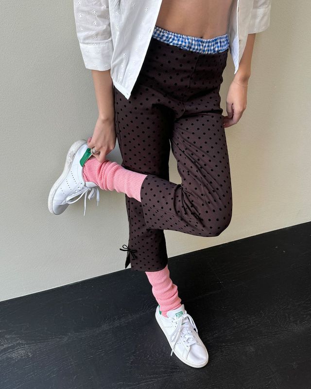 패션 인플루언서 민주는 귀여운 도트 무늬가 들어간 카프리 팬츠 안에 깅엄 체크 쇼츠를 입고 핑크색 루즈 양말을 매치했습니다. 전혀 예상치 못한 조합이라 더욱 재기발랄하고 신선하죠?
