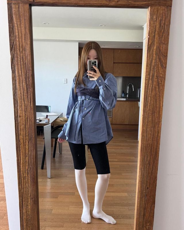 콘텐츠 크리에이터인 오눅 역시 카프리 팬츠 안에 화이트 스타킹을 신었습니다. 엉덩이를 덮는 기장의 보이 프렌드 셔츠 위에 브라톱을 매치한 것까지 그만의 센스가 돋보이는 룩이네요.