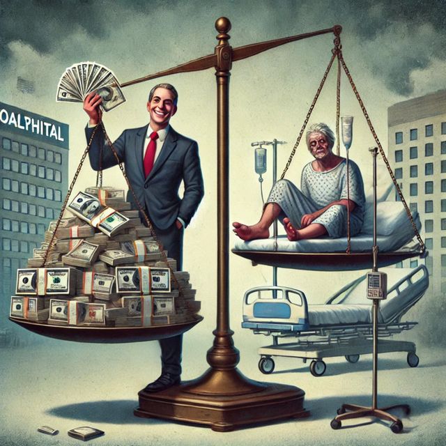 ▲ 미국 의료 시스템의 불균형을 보여주는 그림입니다. 부유한 사람이 돈을 들고 자신만만한 표정을 짓는 반면, 환자는 병상에 앉아 불안해하며 의료비 청구서를 바라보고 있습니다. 기울어진 저울이 의료 시스템의 불평등을 상징적으로 드러냅니다.