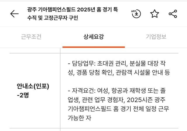 최근 온라인 구직 사이트에는 KIA 타이거즈의 홈구장 광주 기아챔피언스필드에서 홈 경기 특수직 및 고정 근무자를 구한다는 공고가 올라왔다.