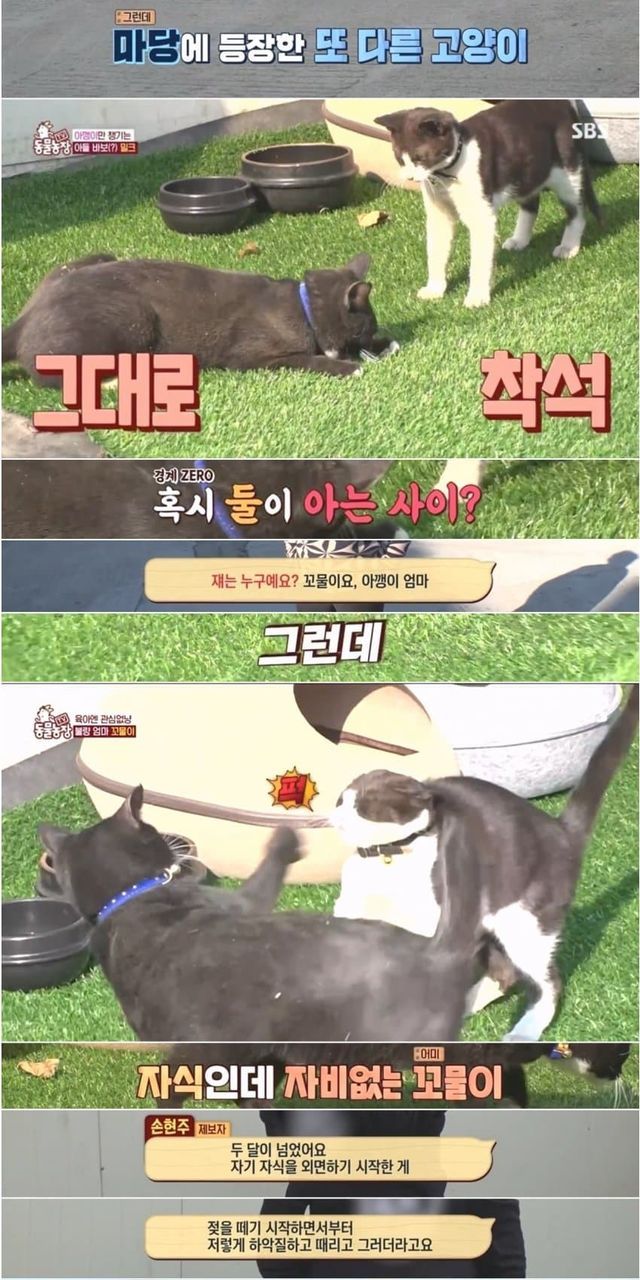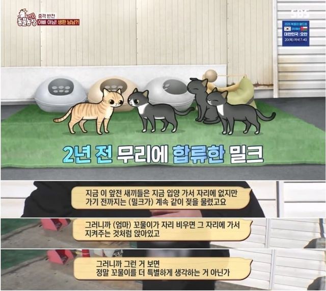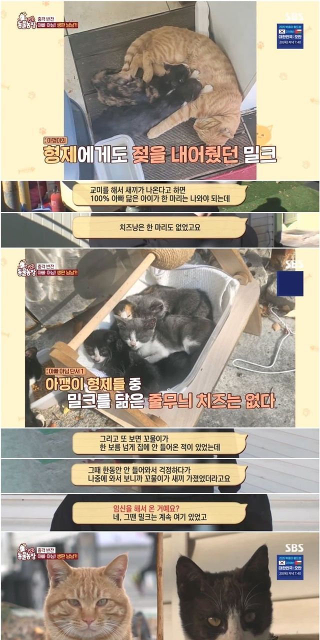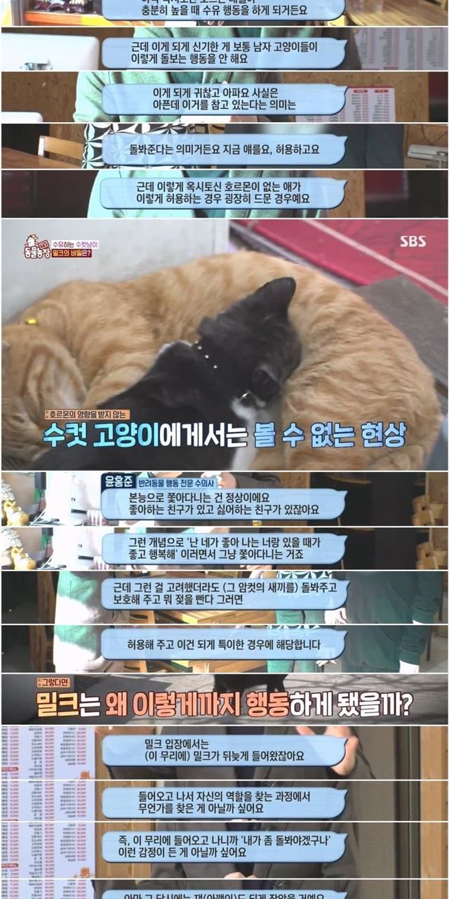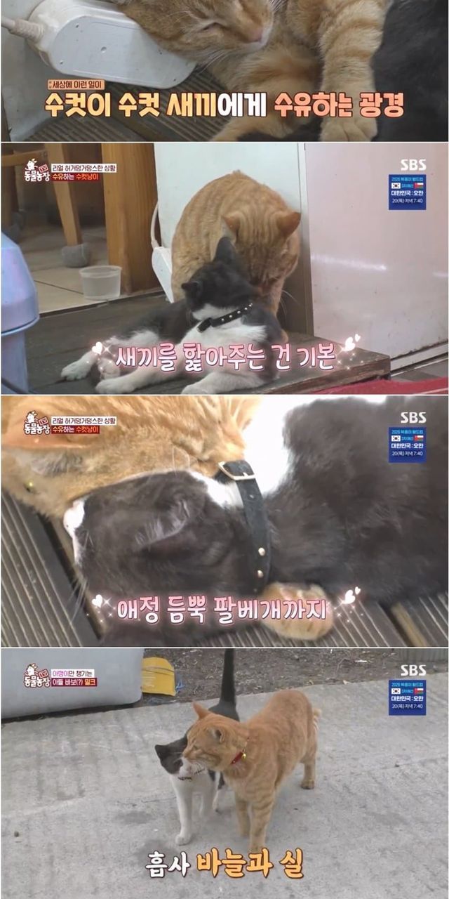 자기 자식도 아닌데 새끼 고양이 젖 먹이는 수컷 고양이