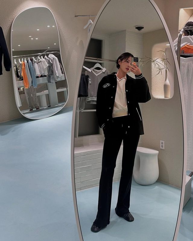 블랙과 화이트의 조화로 완성한 클래식 룩도 돋보였다. 블랙 바시티 재킷과 화이트 폴로 셔츠, 블랙 팬츠를 매치한 그녀의 룩은 심플하면서도 강렬한 분위기를 연출했다. 룩의 중심을 잡아주는 바시티 재킷의 디테일이 스타일의 완성도를 높였고, 올블랙 코디에 화이트 셔츠가 포인트 역할을 하며 전체적인 룩의 균형을 잡아주었다.