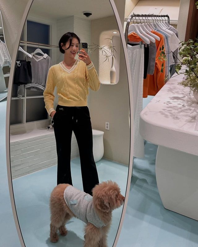 또 다른 룩에서는 상반된 분위기를 보여주었다. 옐로 컬러의 니트와 블랙 팬츠를 조합해 산뜻하면서도 클래식한 무드를 연출했다. 니트의 브이넥 디자인이 포인트가 되어 얼굴을 더욱 화사하게 만들어 주었다. 블랙 팬츠의 슬림한 핏이 다리를 길어 보이게 하고, 심플한 스타일링이 더욱 빛을 발하게 했다.