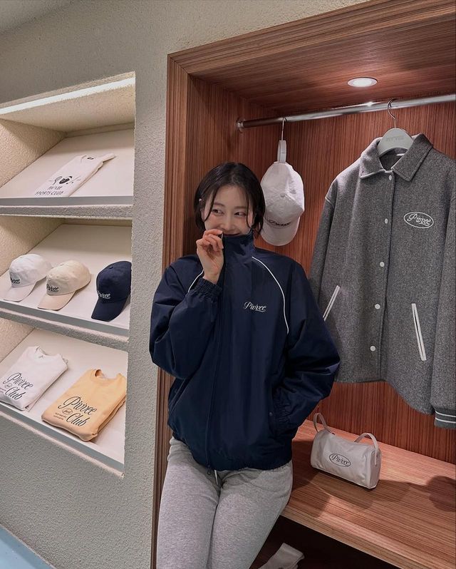 네이비 윈드브레이커 룩도 시선을 끌었다. 그녀는 가벼운 아우터를 활용해 스포티한 스타일을 연출했다. 어깨선이 자연스럽게 드롭된 디자인이 편안한 느낌을 주었고, 깔끔한 라인 덕분에 단순히 스포츠웨어가 아닌 세련된 애슬레저 룩으로 소화했다. 여기에 모노톤의 캡과 스웻팬츠를 매치해 미니멀한 감각을 더했다.