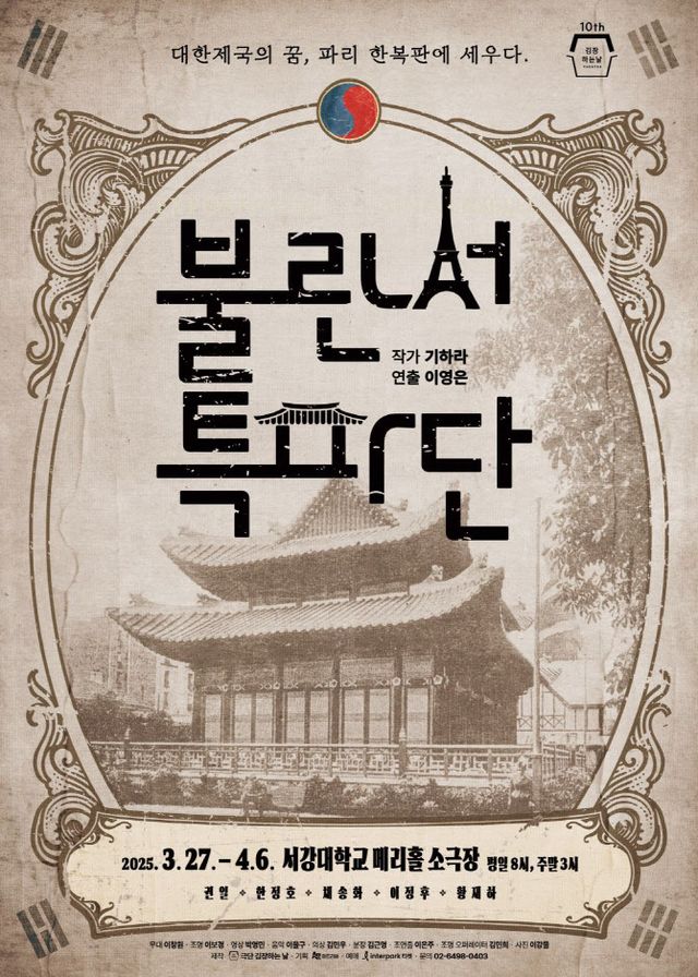 1900년 만국박람회를 앞둔 불란서(프랑스) 파리. 대한제국 대사 민영찬은 목수 2명과 함께 불란서로 특파된다. 파리에 대한제국관을 건설하고 근대국가로서 만국박람회에 참여하기 위해서다. 파리에 도착한 민영찬 일행을 기다리고 있던 것은 열악한 환경과 강대국의 텃세였다. 가진 것이라고는 맨손이 전부인 이들은 경복궁 근정전을 바탕으로 대한제국관을 짓기로 한다. 거대한 문명의 충돌 속 개인의 이야기를 그린 작품이다. 기하라 극작, 이영은 연출로 배우 권일, 한정호, 채송화, 이정후, 황재하 등이 출연한다.