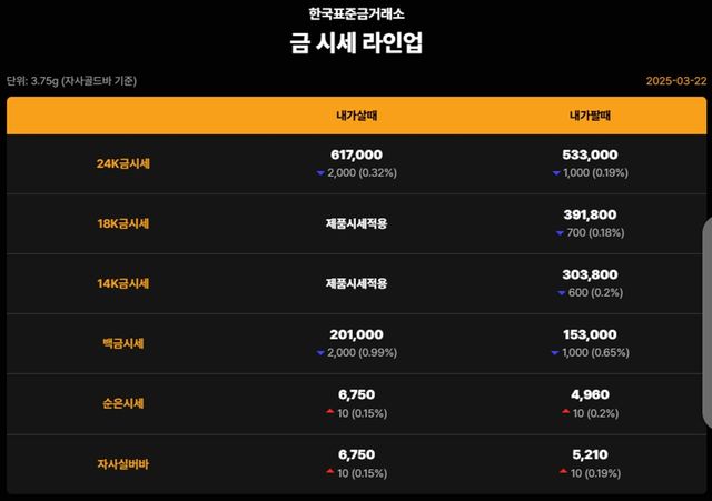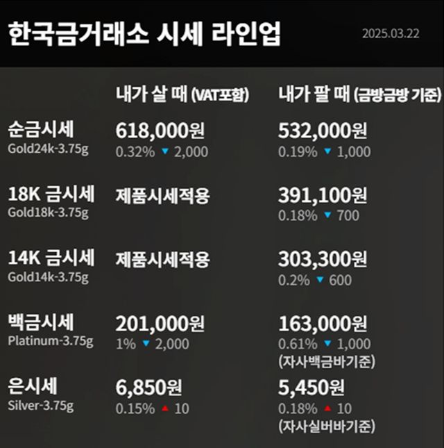 순금(24K) : 매입가 61만 8000원 / 매도가 53만 2000원