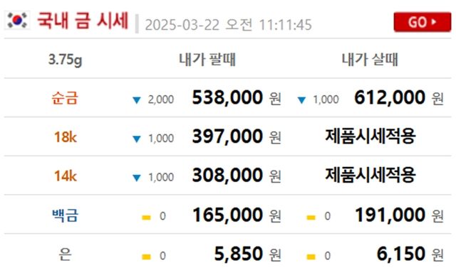 순금(24K) : 매입가 61만 2000원 / 매도가 53만 8000원