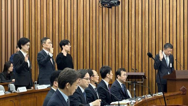 홈플러스 경영진이 지난 18일 국회 정무위원회 현안질의에 앞서 증인 선서하고 있다. =배예진 기자