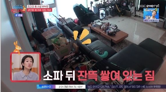 소파 뒤에는 짐들이 잔뜩 쌓여 있었다. 스튜디오에서 보던 홍진경은 놀란 표정을 숨기지 못했다. 딸들 방 앞에도 조갑경의 짐들이 가득했다.