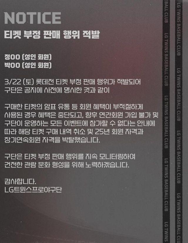 이번에 엘지가 암표 판매한 장기 회원 두명 영구 정지 때리고 인스타에 효수 해둠