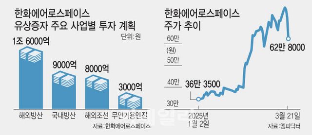 전날 한화에어로스페이스가 3조 6000억원에 달하는 대규모 유상증자를 단행한다고 발표하면서다. 유럽, 중동, 호주, 미국 등지에 직접 설비 투자와 지분 투자 등을 통해 현지 생산 거점을 확보한다는 계획이다. 또 2035년 연결 매출 70조원, 영업이익 10조원 규모의 글로벌 탑티어 기업으로 성장한다는 목표다.