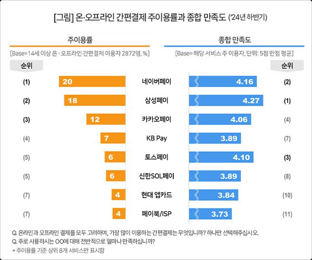 만족도에선 삼성페이가 여전히 네이버페이에 우세했고, 기대를 모았던 애플페이는 이용률·만족도 모두 부진했다.