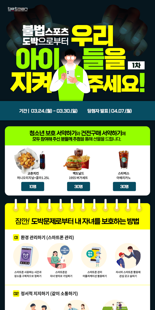 ‘청소년 도박 예방 캠페인’은 베트맨 홈페이지에서 청소년 보호 서약을 하는 방식으로 진행된다. 서약에 참여한 베트맨 이용자는 자동으로 경품 추첨 대상자로 등록되며, 추첨을 통해 ▲교촌치킨 허니오리지널 및 콜라세트(10명) ▲맥도날드 1955 버거 세트(30명) ▲스타벅스 아메리카노(30명) 등 다양한 경품이 제공된다. 경품 당첨자는 4월 7일(월) 발표된다.