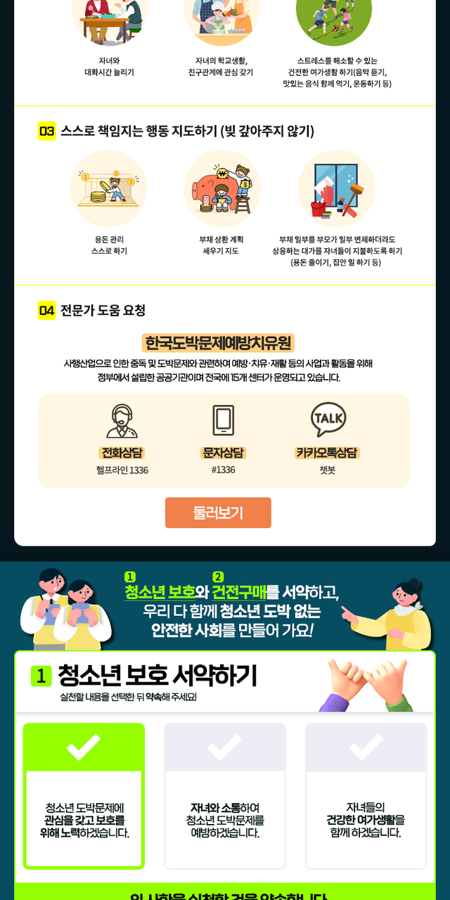 이에 그치지 않고 도박 문제에 노출된 청소년이 ‘한국도박문제예방치유원’의 전화(헬프라인 1336), 문자(#1336), 카카오톡(챗봇) 상담과 함께 ‘청소년 도박 SOS’ 원스톱 서비스를 받을 수 있도록 지원 체계도 마련했다.