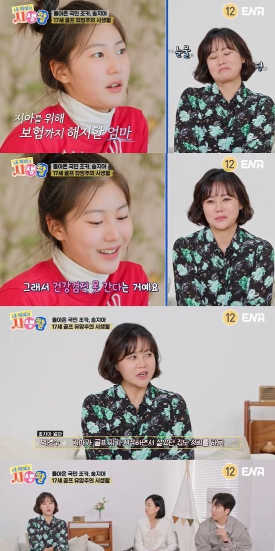 송지아는 한 번 다녀오는 데 2천만 원이 넘게 드는 전지훈련 비용 등을 언급하며 "골프를 직업으로 하는 것은 나보다 부모님이 더 힘든 일 같다"면서 "엄마가 지난 번에 울면서 골프 전지훈련 때문에 보험까지 해지했다고 얘길 하더라. 그래서 건강검진을 못 간다고 하는 것이다"라고 미안해했다.