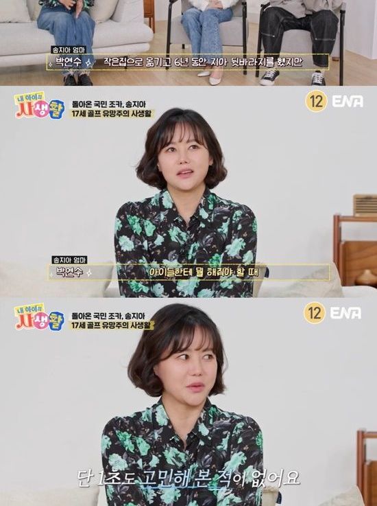 스튜디오에서 송지아의 모습을 지켜보던 박연수는 울컥하며 "지아가 골프를 시작하면서 살았던 집도 정리를 하고 작은 집으로 옮겼다. 6년 동안 지아 뒷바라지를 했지만, 아이들한테 뭘 해줘야 할 때 단 1초도 고민해 본 적이 없다"며 강인한 엄마의 모습을 보였다.