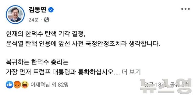 김동연 지사는 이날 자신의 SNS 페이스북을 통해 이같이 말하며 "복귀하는 한덕수 총리는 가장 먼저 트럼프 대통령과 통화하십시오"라고 말했다.