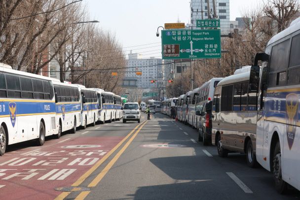 윤석열 대통령 탄핵심판 사건이 헌법재판소에 접수된 지 96일째인 20일 서울 종로구 헌재 인근에서 경찰이 차벽으로 헌재 인근을 통제하고 있다. (사진=이영훈기자)