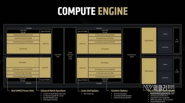 컴퓨트 유닛에는 ▲향상된 메모리 서브 시스템 ▲개선된 스칼라 유닛 ▲동적 레지스터 할당 ▲향상된 유닛 효율 및 작동 속도 등이 적용되며 기본기를 다졌다. 기본적인 뿌리는 RDNA 3에 있지만, 특정 처리 유닛의 효율을 개선하고 캐시 메모리 확대 등으로 전반적인 성능 개선이 가능하다.