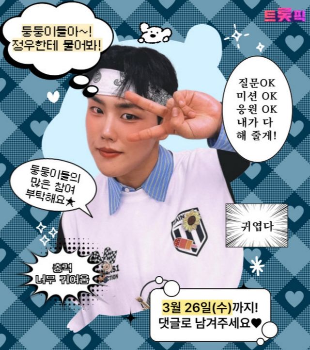 ‘트롯픽’ 측은 “‘고정우의 힐링푸드는 무엇인가요?’ ‘하트3종 보여주세요!’ ‘해물뚝배기 보이스 정우님! 항상 응원합니다’ 등 예시처럼 신곡 ‘팔자’로 돌아온 고정우에게 다양한 질문과 사랑을 많이 보내달라”라고 참여를 독려했다.