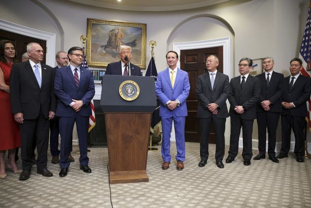 도널드 트럼프 미국 대통령이 24일(현지 시간) 백악관 루스벨트룸에서 현대차그룹의 대미 투자계획을 발표하기 앞서 발언하고 있다. 정의선 현대자동차그룹 회장은 이날 미국 백악관에서 “향후 4년동안 210억달러(약 30조8175억원)의 (대미) 신규투자를 발표한다”고 밝혔다. 오른쪽 네번째부터 정의선 현대차그룹 회장, 장재훈 현대차 부회장, 성 김 현대차 사장, 서강현 현대제철 사장. 2025.03.25. [워싱턴=AP/뉴시스]