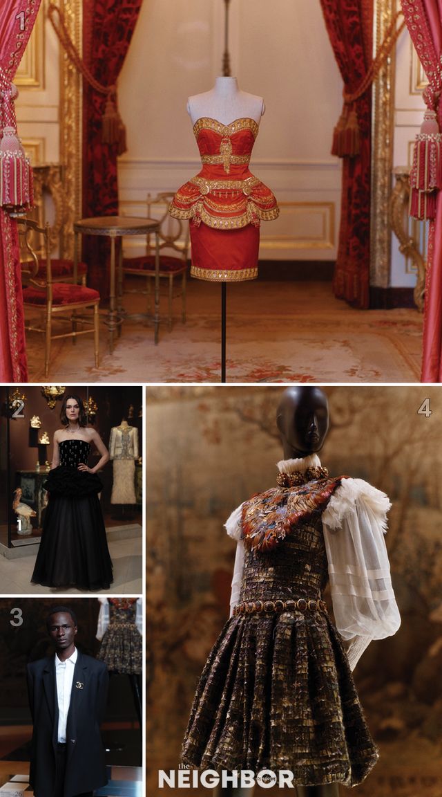 1 칼 라거펠트의 1987-1988 가을/겨울 컬렉션 레드 쿠튀르 드레스. 2 르 그랑 디네 뒤 루브르에 참석한 배우 키이라 나이틀리. 3 르 그랑 디네 뒤 루브르에 참석한 모델 맬릭 보디안. 4 르네상스의 남성성에서 영감을 얻은 칼 라거펠트의 컬렉션.