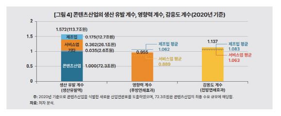 특히 경제적 파급 효과를 측정하는 영향력 계수를 분석한 결과 콘텐츠 산업의 계수는 0.955에 달해 전체 서비스업 평균(0.889)보다 높았으며, 33개 산업 중에는 19위를 차지했다. 이 연구위원은 “전체 산업 평균에는 미치지 못하지만, 운송 서비스(0.951), 도소매 및 상품중개서비스(0.931), 전문과학·기술서비스(0.917) 등 다른 서비스 산업들보다는 높았다”고 짚었다.