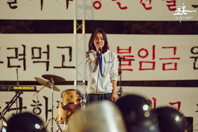 극중 소리패 들꽃소리 신입인 주인공 민영은 부회장인 진욱(윤동원)을 비롯한 선배들과 함께하면서 잘 몰랐던 사회적 문제에 관심을 두게 되고, 삼형공업 파업 시위에 연대하게 된다. 경찰과 백골단 등의 진압이 거세지는 가운데 무대에 홀로 올라 노래를 부르며 “우리는 폭도가 아니에요”라고 연설하는 장면은 영화의 시작과 끝을 장식하는 명실상부 하이라이트다.