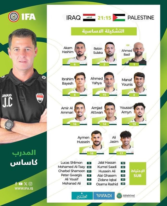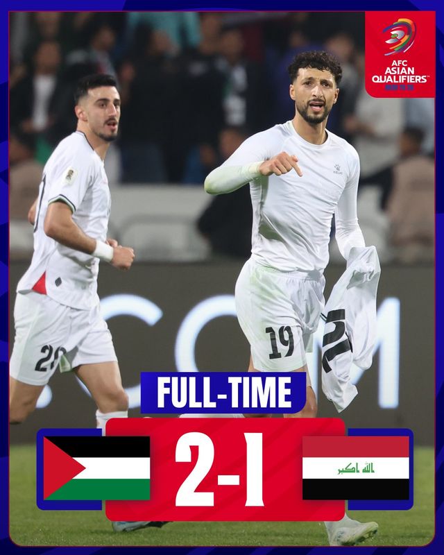 이라크는 26일(한국시간) 요르단 암만에 위치한 암만 국제경기장에서 열린 팔레스타인과의 2026 국제축구연맹(FIFA) 북중미 월드컵 아시아 지역 3차예선 B조 8차전서 1-2로 역전패 했다.