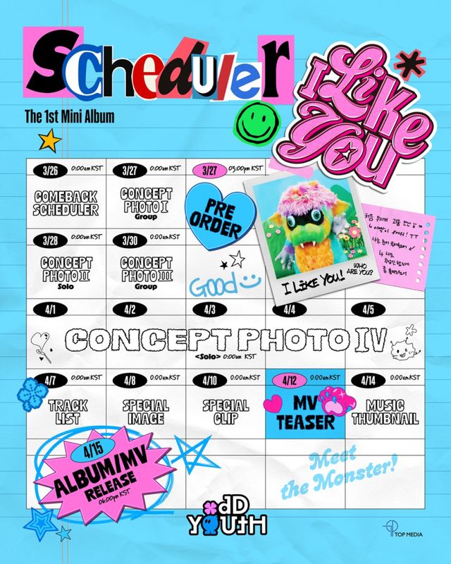 공개된 스케줄러는 스카이 블루 컬러 바탕에 달력 형식의 디자인으로 제작돼 날짜별 프로모션 일정이 상세히 담겨 있다. 유니크한 타이포그래피와 멤버들의 개성 넘치는 손글씨 등으로 구성됐다.