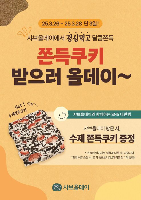 이번 이벤트는 오늘 26일부터 28일까지 단 3일간, 전국 샤브올데이 매장에서 런치 타임에 한해 한정 수량으로 운영된다. 방문 고객에게는 테이블당 수제 쫀득쿠키 1개가 증정되며, 준비된 수량 소진 시 조기 종료될 수 있다.