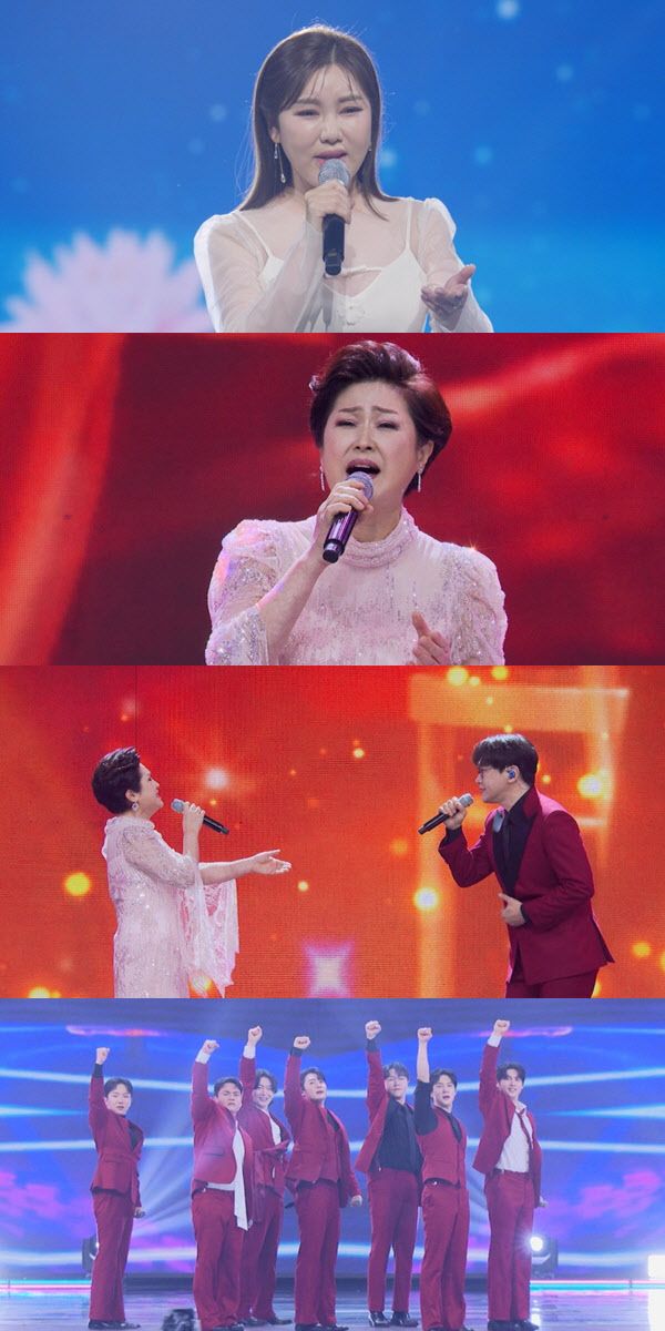 이날 함께 무대에 오른 송가인과 천록담은 ‘평생’이라는 곡으로 호흡을 맞춘다. 개성 강한 두 사람의 음색과 가창력, 짙은 감성이 어우러져 현장은 감동의 도가니가 된다. 무대 직후 천록담은 “하늘 같은 (트롯) 선배님이기 때문에 너무 떨린다. 나는 (트롯) 신생아다. 긴장을 많이 해서 땀이 난다”라고 듀엣 소감을 밝힌다. 이어 송가인이 천록담을 듀엣 상대로 고른 이유를 공개해 모두를 깜짝 놀라게 한다.