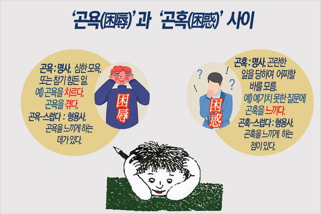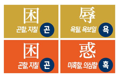 한번은 ‘곤욕’과 ‘곤혹’을 어색하게 표현한 부분이 보여서 유념해 두었는데, 구체적으로 기억이 나지 않아서 찾지는 못했다. 둘 다 한자어인데, ‘곤(困)’은 ‘곤할, 지칠 곤’ 자, ‘욕(辱)’은 ‘욕될, 욕보일 욕’ 자고, ‘혹(惑)’은 ‘미혹할, 의심할 혹’ 자다.