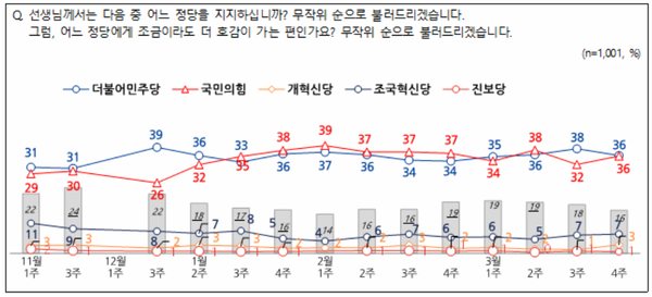여론조사기관 엠브레인퍼블릭·케이스탯리서치·코리아리서치·한국리서치가 지난 24일~26일 전국 만 18세 이상 남녀 1001명을 대상으로 실시한 여론조사에서 정당 지지율은 더불어민주당 36%, 국민의힘 36%, 조국혁신당 7%, 개혁신당 3%, 진보당 1%로 나타났다. 국민의힘은 지난 조사에 비해 4%p 상승했고, 민주당은 2%p 하락했다.