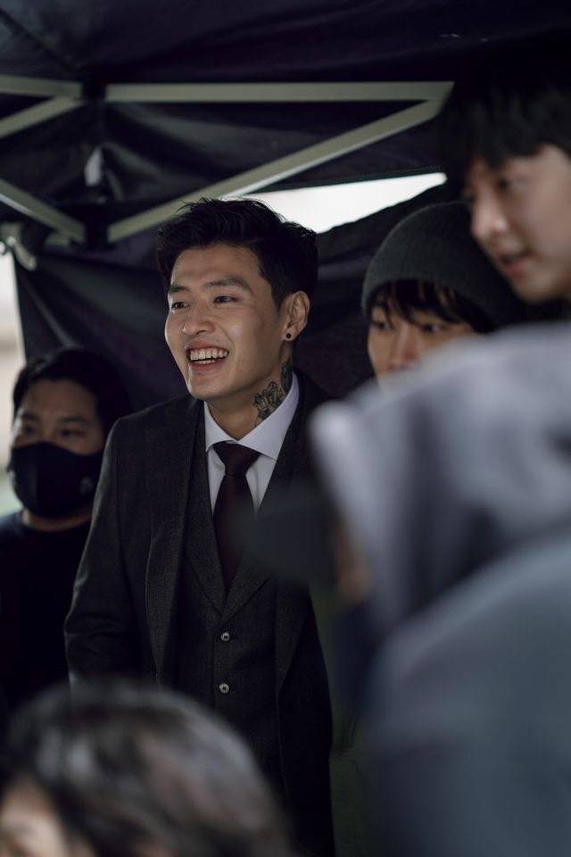 공개된 비하인드 스틸에서는 ‘우상’ 캐릭터와 180도 다른 강하늘의 해맑은 모습이 눈길을 끈다. 강렬한 헤어스타일과 파격적인 문신, 풀 세트 정장으로 완벽하게 ‘우상’ 캐릭터로 변신한 강하늘은 카메라가 꺼진 순간 소품을 가지고 장난을 치기도 하고, 촬영 장면을 모니터링하며 환한 웃음을 보여 훈훈한 매력을 뽐낸다. 조장호 감독은 “원테이크 촬영으로 방대한 대사량을 소화했던 강하늘에게서 그날 촬영분이 끝난 이후 ‘우상’ 캐릭터에 대해 디테일한 고민을 담은 연락이 오기도 했다. 반면 현장에서는 스태프들과 편하게 어울리다가 슛 사인이 들어가면 돌변하는 배우의 정석같은 모습이었다”고 갭차이 확실했던 강하늘의 촬영 비하인드를 전했다.