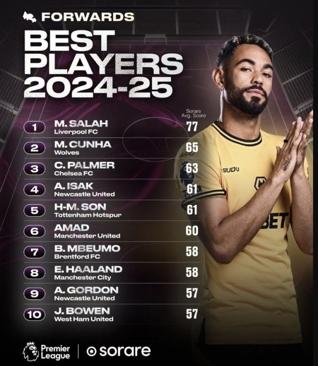 스포츠 게임 기업 '소라레(SORARE)'는 2024-2025시즌 프리미어리그 최고의 공격수 10명을 공개했다. 현재 열리는 있는 프리미어리그 경기에서의 성적에 각 구단이 갖고 있는 해당 선수의 능력과 마케팅 가치 등을 합한 총체적인 선수의 가치가 도출됐다.