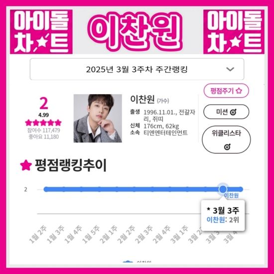 아이돌차트는 최근 이찬원이 2025년 3월 3주 차 평점 랭킹에서 117,479표를 받아 2위를 차지했다고 밝혔다.