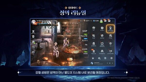 더해서 장비 제작을 위한 ‘강철공방’은 성역 내 시스템이 아닌 메인 메뉴로 위치를 옮기며, 85레벨 이상 장비만 제작할 수 있도록 변경된다. 외에도 ‘지휘본부’ 삭제, 오르비스의 숨결 삭제와 모든 건물 최대 강화 상태 고정 등 ‘성역’ 전반의 불편함은 줄이고, 쾌적하게 각종 보상을 획득할 수 있도록 개선이 이뤄진다.