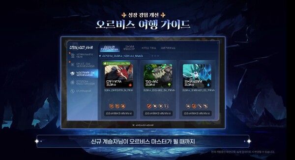 성장 체계 개편에서는 각종 파편화된 플레이 가이드를 통합한 ‘오르비스의 여행 가이드’를 선보인다. 웹 이벤트 등 서로 다른 갈래에서 제공하던 성장 가이드와 보상을 통합하고, 하나의 가이드에서 편리하게 각종 정보를 확인할 수 있도록 이용자들을 도울 예정이다.