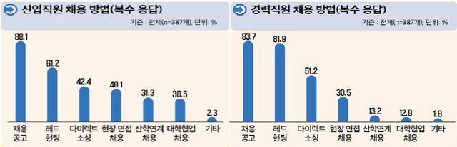 조사 결과 응답 기업(387개)은 직접 인재를 찾아 나서는 방식을 속속 도입하고 있었다. 특히 경력직원 채용 중심으로 다이렉트 소싱(51.2%)을 많이 활용하는 것으로 나타났다. 신입직원 채용 때도 다이렉트 소싱을 활용하는 기업은 42.4%에 달했다.