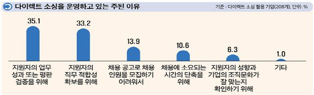 다이렉트 소싱을 운영하는 이유로 기업들은 ‘지원자 업무성과 또는 평판 검증을 위해’(35.1%), ‘지원자 직무 적합성 확보를 위해’(33.2%), ‘채용 공고로 채용 인원을 모집하기 어려워서’(13.9%) 등의 이유를 꼽았다.