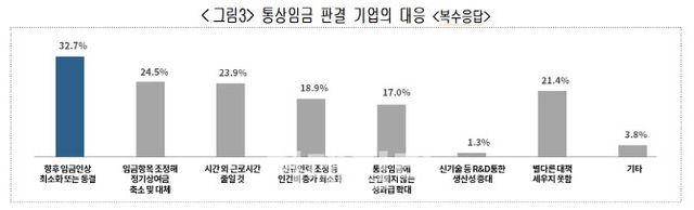 늘어난 인건비 부담에 기업들은 임금인상을 최소화하고 정기상여금을 대체하는 동시에 신규인력을 줄이는 방향으로 대응을 계획 중이다. 대응책을 묻는 질문에 기업의 32.7%가 ‘임금인상 최소화’라고 답했다. 이어 △정기상여금 축소 또는 대체(24.5%) △시간 외 근로시간 축소(23.9%) △신규인력 줄이는 등 인건비 증가 최소화(18.9%) △통상임금에 산입되지 않는 성과급 확대(17.0%) 등의 순이었다. 별다른 대책을 세우지 못한 기업도 21.4%에 달했다.