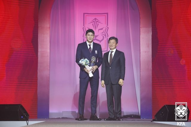'2023 KFA 어워즈'에서 올해의 선수상을 수상한 뒤 정몽규 회장과 기념촬영을 한 축구 선수 김민재 / 뉴스1