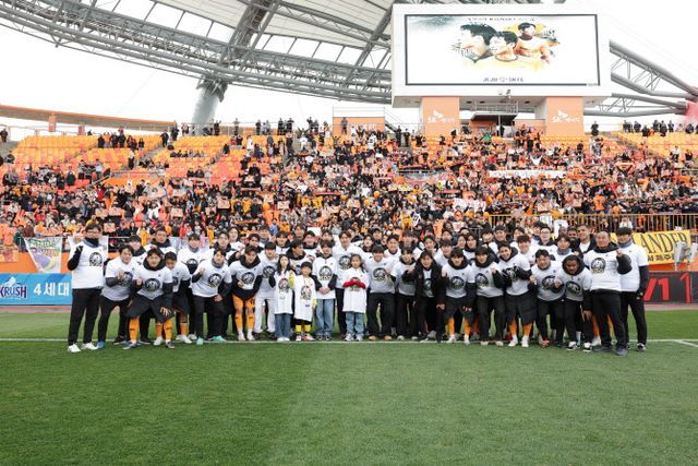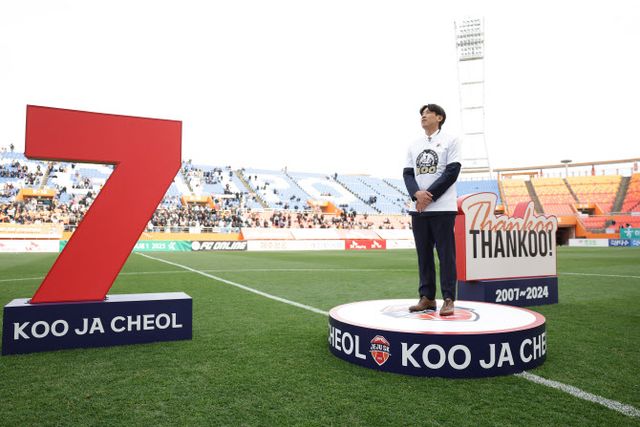 이날 제주는 구단을 넘어 한국 축구의 레전드인 구자철을 위해 특별한 은퇴식을 준비했다. 선수단 전원이 구자철의 은퇴를 축하하는 ‘7HANK KOO’ 문구가 새겨진 티셔츠를 입었다. 구자철의 상징인 등번호 7번 조형물 등으로 무대를 세팅했다.