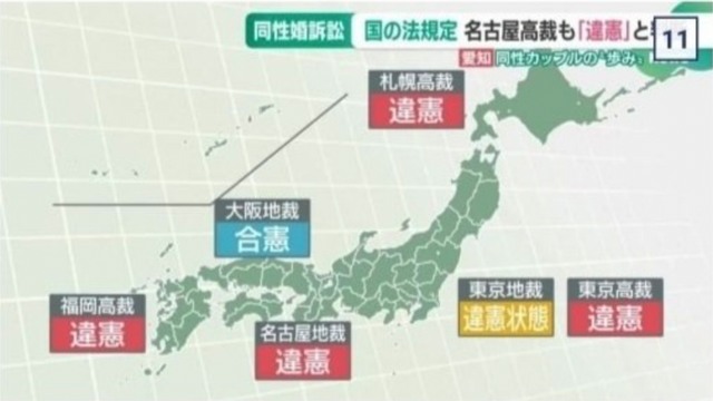 동성결혼 제도 부재에 대한 재판이 일본 곳곳에서 진행 중인데 5개 법원에서 위헌판결, 1개 법원에서 위헌상태, 1개 법원에서 합헌 판결 나옴