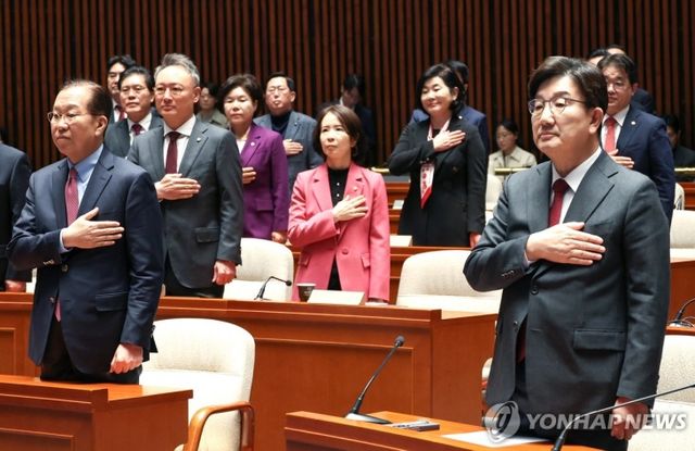 국민의힘 권영세 비상대책위원장(왼쪽)과 권성동 원내대표가 2일 서울 여의도 국회에서 열린 의원총회에서 국기에 경례하고 있다. 연합뉴스